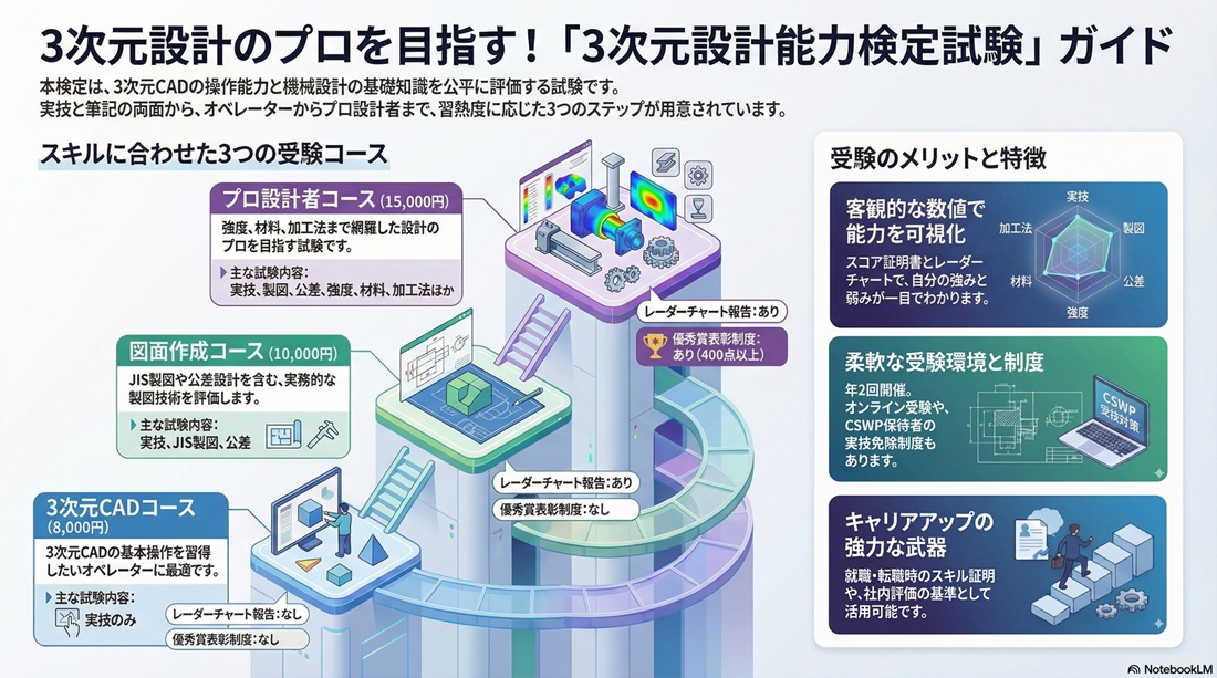 3次元設計能力検定協会では、3次元CADのオペレーション能力、機械設計の基礎的能力を客観的で公平に評価する検定試験を実施しています。